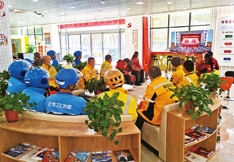 圖為2022年10月16日,江蘇省宿遷市宿豫區(qū)委“兩新”工委在區(qū)新就業(yè)群體黨群服務(wù)中心組織快遞員、外賣配送員等集中收聽收看黨的二十大開幕會。 江蘇省委組織部供圖