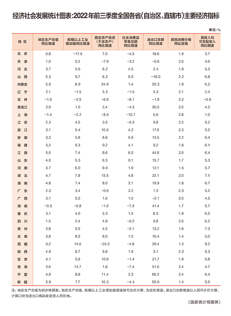 經(jīng)濟(jì)社會(huì)發(fā)展統(tǒng)計(jì)圖表:2022年前三季度全國(guó)各?。ㄗ灾螀^(qū)、直轄市)主要經(jīng)濟(jì)指標(biāo)