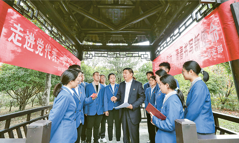 圖為2022年11月21日,黨的二十大代表在江蘇淮安與大學生分享黨的二十大報告學習感悟。 人民圖片 趙啟瑞/攝