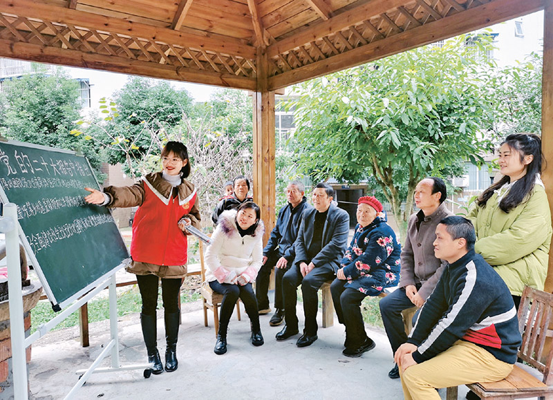 圖為2022年11月30日,四川省眉山市仁壽縣黑龍灘鎮(zhèn)流動“小黑板”宣講小分隊在四海社區(qū)宣講黨的二十大精神。 人民圖片 潘帥/攝