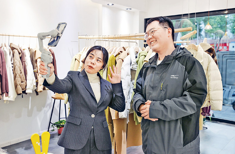 圖為2022年11月30日,在烈士塔社區(qū)一家商鋪內(nèi),網(wǎng)絡(luò)直播主播在幫助商戶(hù)開(kāi)展直播帶貨。 南京市浦口區(qū)融媒體中心供圖 王俊/攝