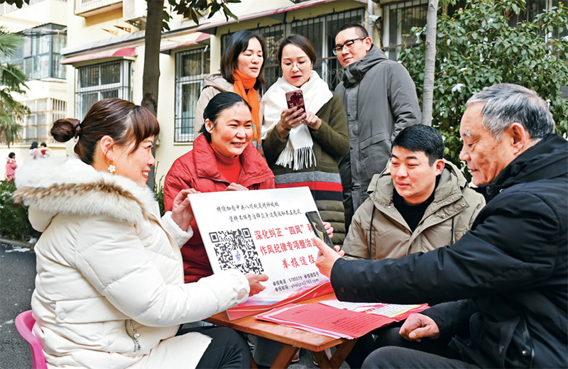 河南省漯河市源匯區(qū)紀(jì)委監(jiān)委發(fā)揮全區(qū)村居監(jiān)察工作站全覆蓋的優(yōu)勢,引導(dǎo)群眾積極利用手機“隨手拍”參與“四風(fēng)”監(jiān)督,形成群防群治、合力監(jiān)督的濃厚氛圍。圖為2022年1月25日,社區(qū)干部向群眾講授如何通過手機網(wǎng)絡(luò)舉報身邊出現(xiàn)的“四風(fēng)”行為。 人民圖片 尤亞輝/攝