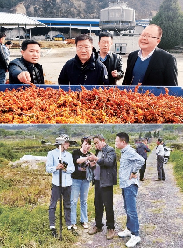 上圖為邱軍(右一)在甘農(nóng)科技調(diào)研沙棘收購情況(中國化學(xué)工程集團(tuán)有限公司供圖);下圖為孫麗美(左二)與同事開展征地測繪工作(福建省委宣傳部供圖)。