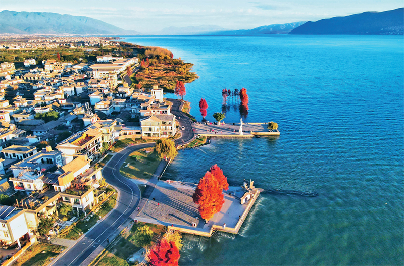 云南省牢記習近平總書記對洱海保護“立此存照,過幾年再來,希望水更干凈清澈”的囑托,加大洱海保護治理力度,取得明顯成效。圖為2022年11月28日,大理白族自治州洱海生態(tài)廊道上的龍龕碼頭。 云南日報供圖 黃興能/攝