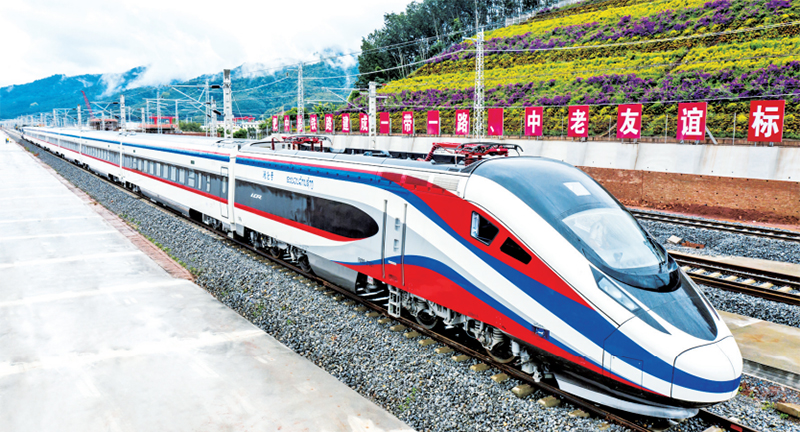 2021年12月3日,中老兩國互利合作的旗艦項目和高質量共建“一帶一路”的標志性工程——中老鐵路全線通車。圖為“瀾滄號”動車組列車正在駛過中老鐵路磨憨站。 云南日報供圖 陳暢/攝
