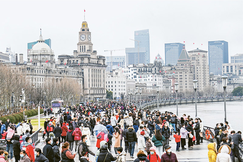 農(nóng)歷兔年春節(jié)假期,上海接待游客1002.29萬人次,實(shí)現(xiàn)旅游收入166.4億元。圖為2023年1月22日,上海外灘游人如織。 人民圖片 鮑贛生/攝
