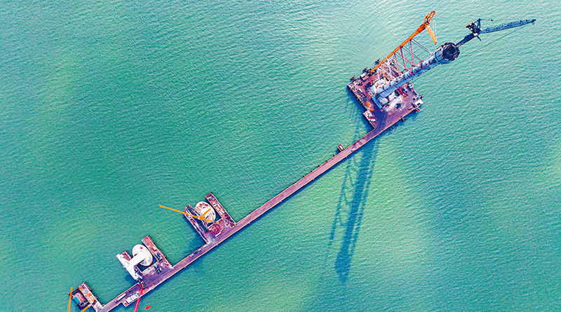 我國(guó)發(fā)揮財(cái)政穩(wěn)投資促消費(fèi)作用,強(qiáng)化政府投資對(duì)全社會(huì)投資的引導(dǎo)帶動(dòng),促進(jìn)恢復(fù)和擴(kuò)大消費(fèi),著力擴(kuò)大國(guó)內(nèi)需求。圖為2023年1月5日,在位于廣東省珠海市高欄港經(jīng)濟(jì)區(qū)的黃茅海跨海通道建設(shè)現(xiàn)場(chǎng),1座主塔和3個(gè)橋墩正拔地而起。 人民圖片 魏勁松/攝