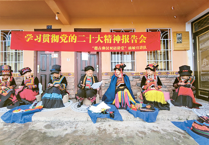 2023年1月15日,在四川省樂(lè)山市峨邊彝族自治縣茗新村,繡娘宣講隊(duì)向群眾宣講黨的二十大精神。繡娘宣講是峨邊基層理論宣講形式之一,重點(diǎn)面向農(nóng)村婦女,利用彝族刺繡培訓(xùn)、農(nóng)民夜校、壩壩會(huì)座談等活動(dòng)開(kāi)展宣講,傳遞黨和政府聲音,講解各類政策,述說(shuō)發(fā)展變化,樹(shù)立文明新風(fēng)。 全國(guó)婦聯(lián)供圖