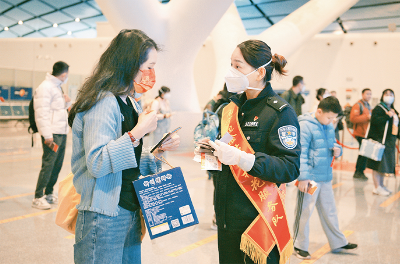 2023年2月6日,在廣西南寧吳圩國(guó)際機(jī)場(chǎng),全國(guó)三八紅旗集體南寧邊檢站“朱槿花服務(wù)隊(duì)”隊(duì)員為旅客解答出入境相關(guān)問(wèn)題。 全國(guó)婦聯(lián)供圖
