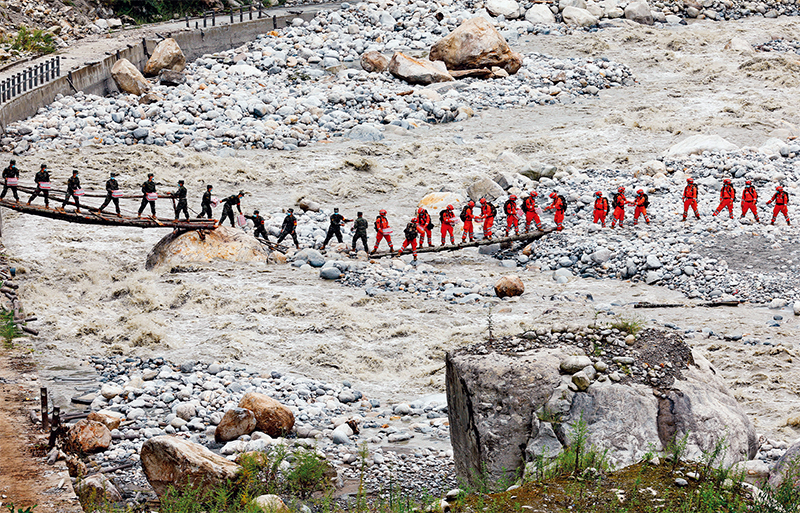 2022年9月5日,四川甘孜藏族自治州瀘定縣發(fā)生6.8級地震,解放軍和武警部隊官兵、民兵預(yù)備役人員馳援災(zāi)區(qū)展開救援。圖為瀘定縣磨西鎮(zhèn)附近,官兵在臨時架設(shè)的小橋上向河對岸的村民運送生活物資。 解放軍畫報供圖 沈伯韓/攝