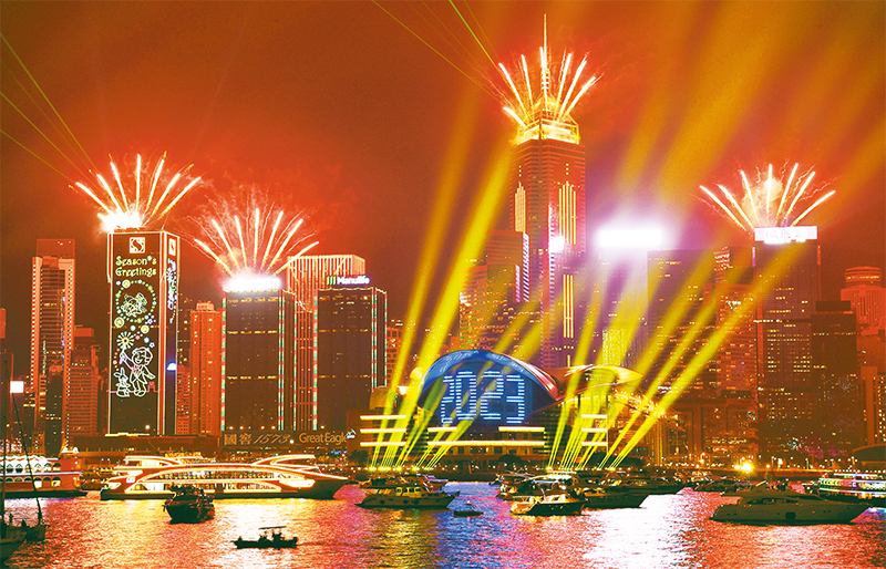 2023年1月1日,香港維多利亞港上演“幻彩詠香江”加強(qiáng)版煙火光影匯演,迎接2023年的到來。 新華社記者 陳鐸/攝