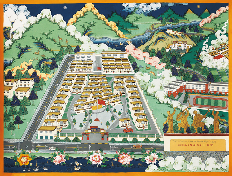 ——一幅《幸福新居》圖,青山掩映,綠樹環(huán)繞,平整的道路蜿延伸展,美麗新居鱗次櫛比。這幅唐卡描繪的是日喀則拉孜縣易地扶貧搬遷點明瑪小區(qū)。2016年,查務(wù)鄉(xiāng)明瑪村整村搬遷到這里,從此告別了高寒艱苦的生活環(huán)境,過上有電有水有網(wǎng)的幸福生活。