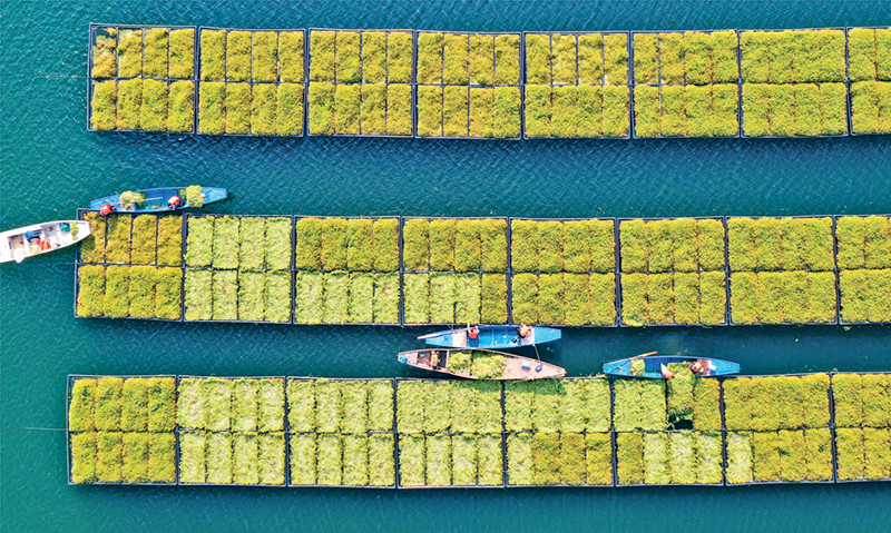 浙江省杭州市淳安縣在千島湖典型庫灣、入湖口等區(qū)域,運(yùn)用生態(tài)浮島水上無土栽培技術(shù)種植水生蔬菜,努力探索“兩山”價(jià)值轉(zhuǎn)化新路徑。圖為2023年2月21日,工作人員正在采摘水生蔬菜。 人民圖片 楊波/攝
