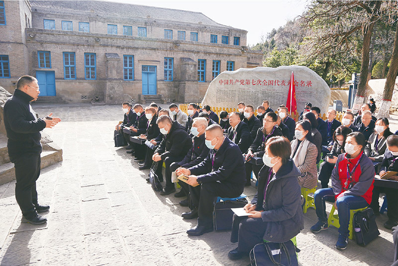 2023年3月1日,中國延安干部學(xué)院學(xué)員在中共七大會(huì)址聆聽專題授課“弘揚(yáng)七大精神,增強(qiáng)‘四個(gè)意識(shí)’”。 中國延安干部學(xué)院供圖