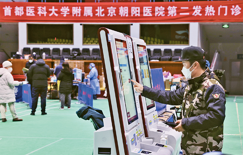 疫情高峰時期,為緩解大醫(yī)院發(fā)熱門診就診壓力,同時為市民就醫(yī)提供更多便利、貼心的服務,北京市統(tǒng)籌醫(yī)療資源,在體育館、文化館等場所啟用簡易發(fā)熱門診,使普通發(fā)熱患者得到有效分流診治。圖為2022年12月,朝陽體育館內(nèi),首都醫(yī)科大學附屬北京朝陽醫(yī)院緊急組建起第二發(fā)熱門診,實現(xiàn)當天啟用當天開診。 北京日報記者 白繼開/攝