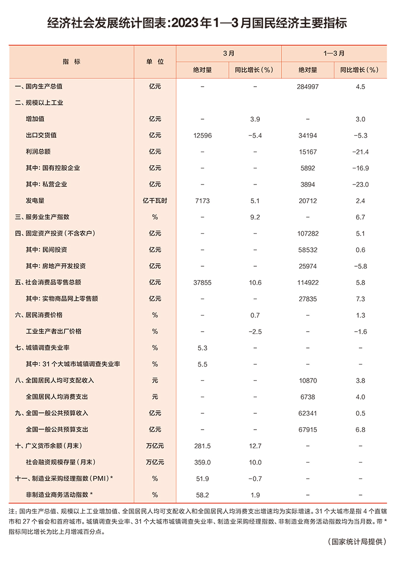 經(jīng)濟(jì)社會(huì)發(fā)展統(tǒng)計(jì)圖表:2023年1—3月國(guó)民經(jīng)濟(jì)主要指標(biāo)