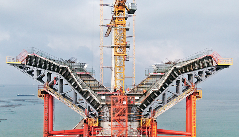 中央企業(yè)把主題教育與貫徹中央重大決策部署結(jié)合起來,切實(shí)抓好服務(wù)構(gòu)建新發(fā)展格局戰(zhàn)略任務(wù)。黃茅海跨海通道是繼港珠澳大橋、深中通道之后,粵港澳大灣區(qū)又一跨海通道工程,由保利長大承建的黃茅海大橋中塔于2023年4月18日順利封頂。圖為4月17日,工人在黃茅??绾Mǖ傈S茅海大橋進(jìn)行墩柱基樁建設(shè)。 新華社記者 鄧華/攝