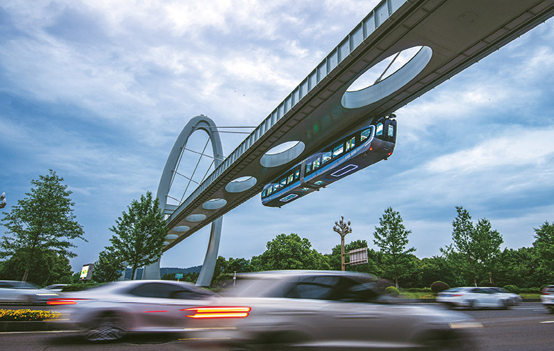 列車懸掛在軌道下方,從人們頭頂飛馳而過,這樣的科幻場景,最近在武漢東湖新技術(shù)開發(fā)區(qū)成了現(xiàn)實。圖為2023年5月9日,武漢“光谷光子號”空軌列車在綜合聯(lián)調(diào)和試運(yùn)行中。 新華社記者 肖藝九/攝