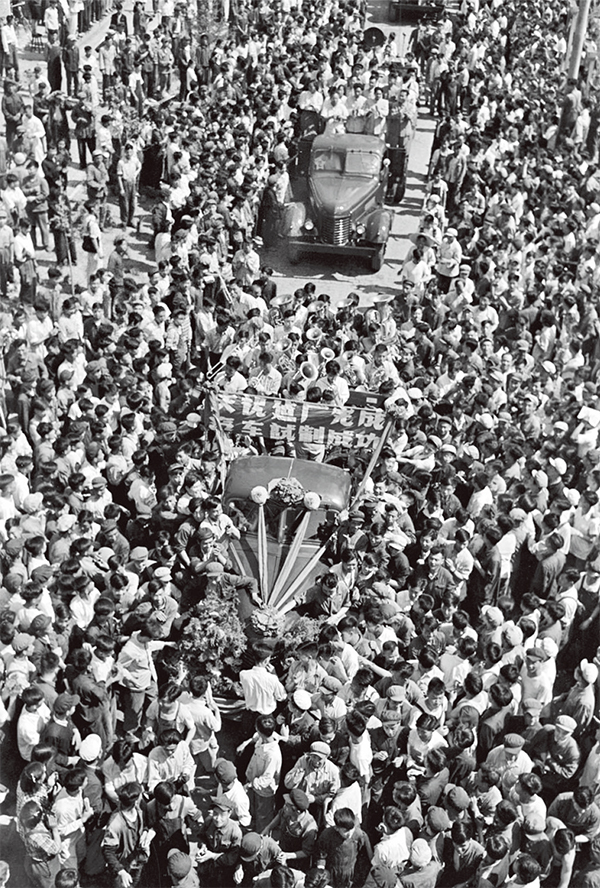 1956年7月15日,長春第一汽車制造廠生產(chǎn)出中國第一輛解放牌汽車,從此結(jié)束了中國不能生產(chǎn)汽車的歷史。圖為第一批國產(chǎn)解放牌載重汽車排成長列開出長春第一汽車制造廠的時(shí)候,全廠職工夾道歡呼。 新華社發(fā)