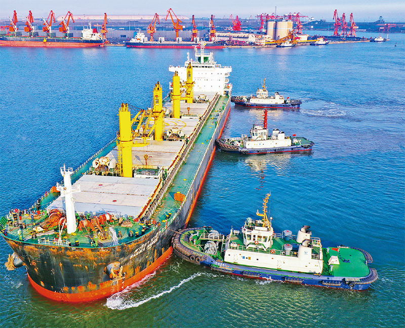 河北省交通優(yōu)勢(shì)便利,已經(jīng)形成陸??站C合交通運(yùn)輸網(wǎng)絡(luò),2022年唐山港貨物吞吐量達(dá)到7.69億噸,躍居世界第二位。圖為一艘輪船在拖輪協(xié)助下向河北港口集團(tuán)唐山港曹妃甸港區(qū)礦石碼頭靠泊。 河北省委宣傳部供圖 史晟全/攝