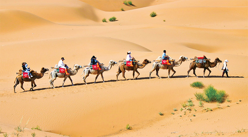 盛夏時(shí)節(jié),地處黃河之畔與騰格里沙漠邊緣的寧夏中衛(wèi)沙坡頭景區(qū)迎來(lái)大批游客。圖為游客在沙坡頭景區(qū)體驗(yàn)駱駝騎行,欣賞大漠風(fēng)光。 求是圖片 楊飛/攝