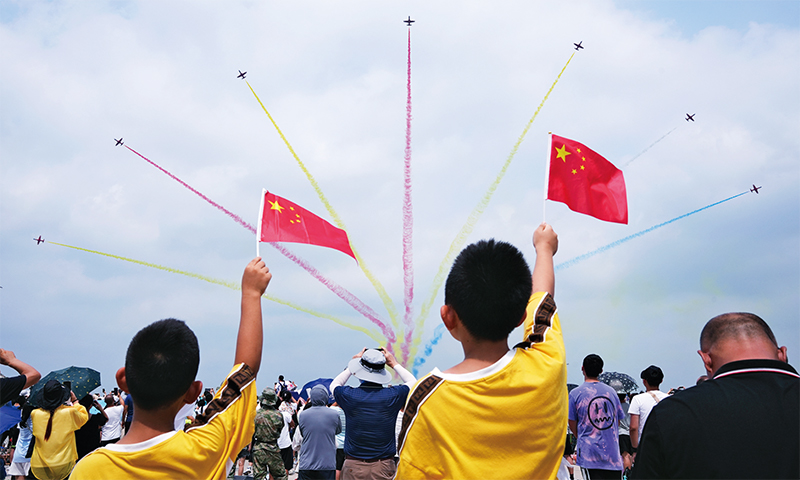 圖為2023年7月27日,在空軍航空開放活動(dòng)·長(zhǎng)春航空展首個(gè)公眾日,觀眾觀看飛行表演。當(dāng)日恰逢抗美援朝戰(zhàn)爭(zhēng)勝利70周年,空軍八一飛行表演隊(duì)特別選用紅、黃、藍(lán)三色拉煙的方式紀(jì)念這一特殊的日子,告慰先輩、激勵(lì)后人。 新華社發(fā) 楊覲源/攝