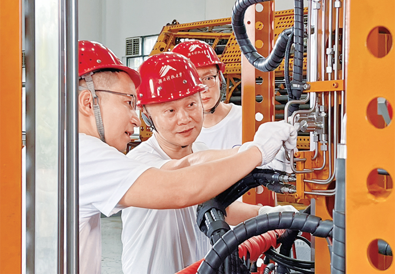 萬步炎關(guān)心和愛護青年人才,對團隊成員關(guān)心關(guān)切、耐心指導(dǎo),毫無保留傳授自己的經(jīng)驗和心得。圖為萬步炎(中)在給團隊成員講解技術(shù)難點。 湖南省委宣傳部供圖 唐亞慧/攝