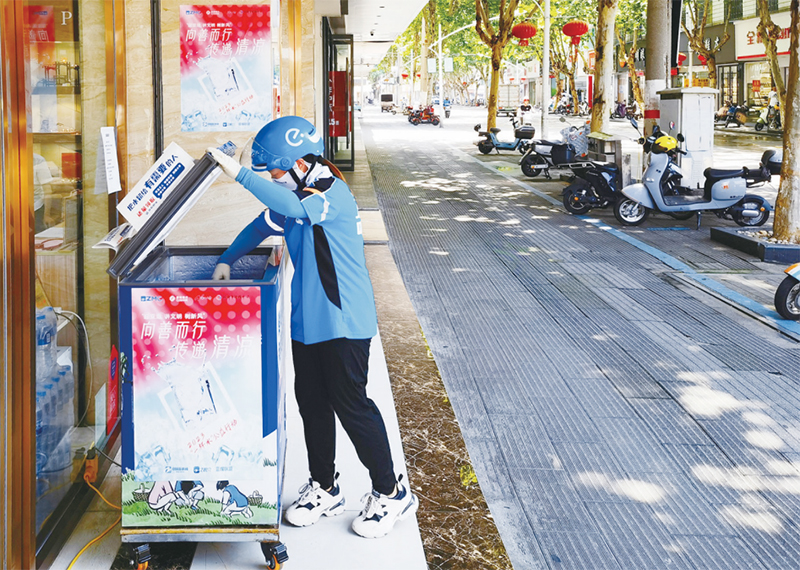 2023年8月7日,一名外賣員在浙江省桐鄉(xiāng)市街頭的“愛心冰柜”取水。在桐鄉(xiāng)市,“一杯水”公益接力已持續(xù)5年,越來越多的商家、市民踴躍加入,為戶外工作者送去愛心。 桐鄉(xiāng)市委宣傳部供圖