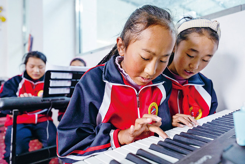 圖為2023年6月5日,在西藏日喀則定日縣扎西宗鄉(xiāng)完全小學(xué),四年級三班的旦增吉宗(前排左)正在和小伙伴上鋼琴課。鋼琴課是該校16個興趣班之一。為了滿足學(xué)生們的各種需求,學(xué)校設(shè)置了信息技術(shù)、美術(shù)、廣播、體育、舞蹈、手工等興趣班,促進學(xué)生全面發(fā)展。 新華社記者 費茂華/攝