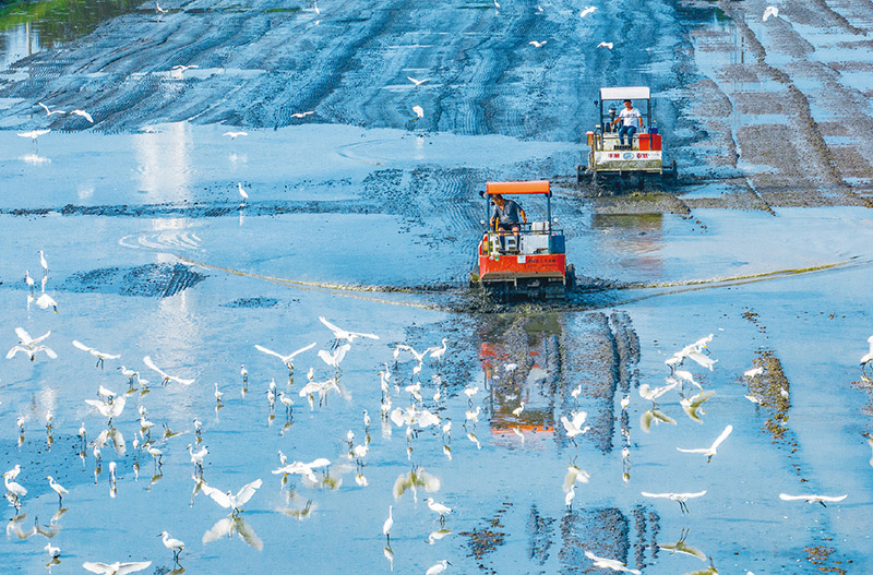 以當(dāng)代中國人權(quán)觀為指引,我國不斷加強環(huán)境權(quán)利保障力度,取得了顯著成效。圖為2023年7月2日,在安徽蕪湖弋江區(qū)義興村,農(nóng)民正駕駛拖拉機翻耕農(nóng)田,成群的鷺鳥伴隨著耕作的拖拉機翩翩起舞,構(gòu)成一幅美麗和諧的生態(tài)田園畫卷。 人民圖片 肖本祥/攝