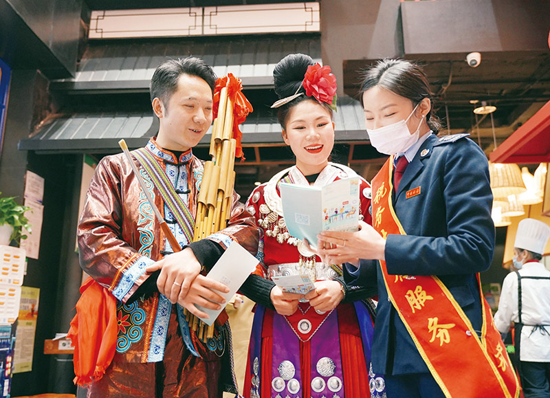 今年以來,稅務(wù)部門優(yōu)化實施小規(guī)模納稅人減征增值稅、小微企業(yè)和個體工商戶減征所得稅等一批覆蓋面更廣的政策,突出對小微企業(yè)、個體工商戶的支持。圖為2023年3月16日,國家稅務(wù)總局貴陽市南明區(qū)稅務(wù)局干部走進當?shù)貒曳沁z項目酸湯魚餐飲店,講解稅收優(yōu)惠政策。 國家稅務(wù)總局供圖 梁詩茂/攝