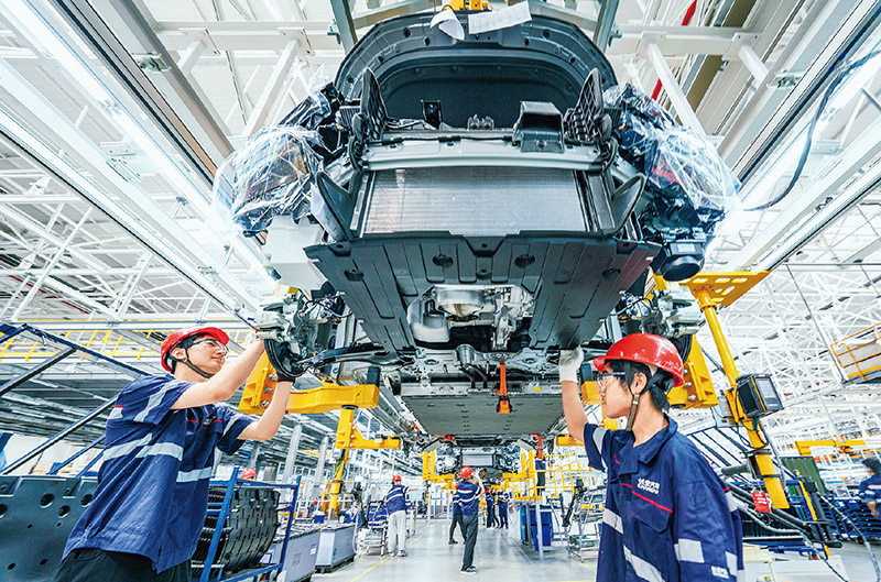 根據(jù)黨中央、國務(wù)院統(tǒng)一部署,我國新能源汽車車輛購置稅減免政策將延長至2027年底。圖為2023年8月18日,位于江蘇南京市溧水區(qū)的南京長安汽車新工廠,工人們正在組裝全新長安新能源SUV,一輛輛新車迅速完成組裝、下線,生產(chǎn)氛圍火熱。 人民圖片 朱紅生/攝