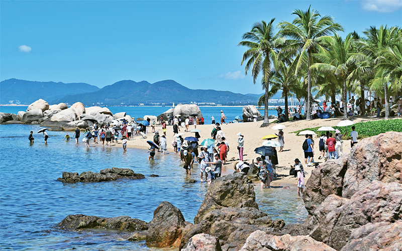 我國(guó)經(jīng)濟(jì)社會(huì)全面恢復(fù)常態(tài)化運(yùn)行以來(lái),消費(fèi)回暖跑出“加速度”,成為經(jīng)濟(jì)增長(zhǎng)的主拉動(dòng)力。圖為2023年10月1日,游客在三亞市天涯海角游覽區(qū)游玩。 新華社記者 郭程/攝