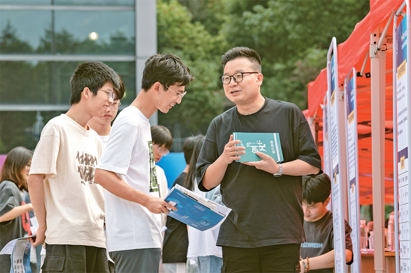 就業(yè)是民生之本、財(cái)富之源,各地區(qū)各部門(mén)堅(jiān)決扛起穩(wěn)就業(yè)責(zé)任,千方百計(jì)穩(wěn)定和擴(kuò)大就業(yè)。圖為2023年10月19日,2023年大中城市聯(lián)合招聘高校畢業(yè)生秋季專(zhuān)場(chǎng)活動(dòng)暨“智選金華 青創(chuàng)未來(lái)”分會(huì)場(chǎng)在浙江省金華職業(yè)技術(shù)學(xué)院舉行,大學(xué)生正與用人單位工作人員交流。 人民圖片 胡肖飛/攝