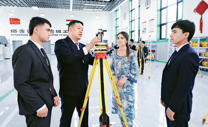 “魯班工坊”,主要目標(biāo)是為合作國家培養(yǎng)高素質(zhì)技術(shù)技能人才,被稱為“一帶一路”上的“技術(shù)驛站”。圖為2023年4月12日,在塔吉克斯坦首都杜尚別的“魯班工坊”內(nèi),一位來自天津城市建設(shè)管理職業(yè)技術(shù)學(xué)院的老師向?qū)W生講解測繪儀器使用方法。 新華社發(fā) 奧斯帕諾夫/攝