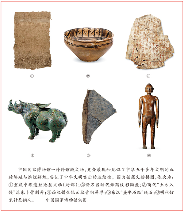 習(xí)近平總書記高度重視中華文明的傳承與發(fā)展,強(qiáng)調(diào)中華文明具有突出的連續(xù)性,從根本上決定了中華民族必然走自己的路。中華文明是世界上唯一綿延不斷且以國家形態(tài)發(fā)展至今的偉大文明。中華文明源遠(yuǎn)流長、博大精深,是中華民族獨(dú)特的精神標(biāo)識,是當(dāng)代中國文化的根基,是維系全世界華人的精神紐帶,也是中國文化創(chuàng)新的寶藏。如果不從源遠(yuǎn)流長的歷史連續(xù)性來認(rèn)識中國,就不可能理解古代中國,也不可能理解現(xiàn)代中國,更不可能理解未來中國。國家博物館現(xiàn)有藏品143萬余件,藏品體系完整,歷史跨度巨大,器物形制多樣,充分展現(xiàn)和見證了中華五千多年文明的血脈綿延與燦爛輝煌。其中許多代表性館藏文物,實(shí)證了五千多年中華文明突出的連續(xù)性。