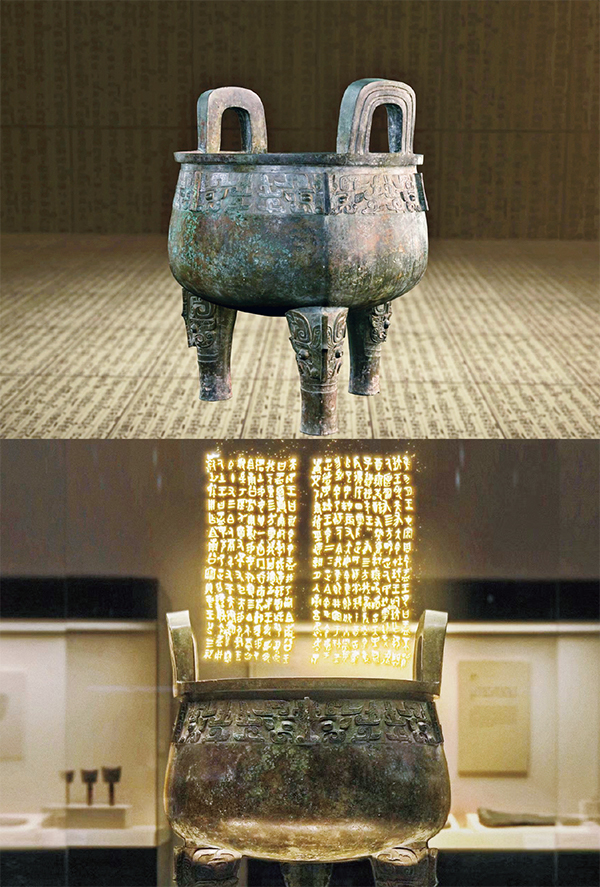 中國國家博物館館藏西周早期大盂鼎,高約102厘米,重153.5公斤,鼎內(nèi)壁鑄有銘文19行,共計(jì)291字,是記載周代歷史的重要文獻(xiàn),是研究周代分封制與冊命制度的重要史料,也是西周金文書法的杰出代表。此圖是運(yùn)用虛擬現(xiàn)實(shí)技術(shù)對大盂鼎銘文進(jìn)行的數(shù)字活化展示,觀眾可直觀真切觀看大盂鼎內(nèi)壁上的銘文。 中國國家博物館供圖