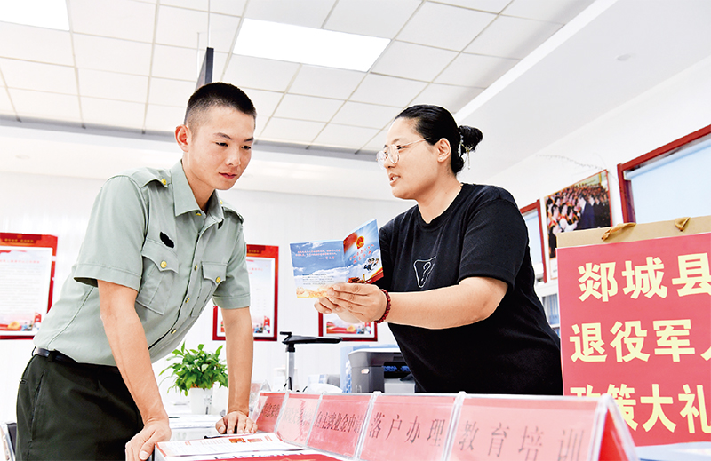 近年來,山東省臨沂市郯城縣退役軍人事務局開展退役軍人接收報到“一站式”服務,讓光榮返鄉(xiāng)退役軍人“兵至如歸”,切實增強退役軍人的獲得感、幸福感、榮譽感。圖為2023年9月1日,郯城縣退役軍人事務局工作人員為退役軍人贈送“政策大禮包”和介紹《退役軍人服務手冊》使用方法。 中新社發(fā) 李結(jié)義/攝