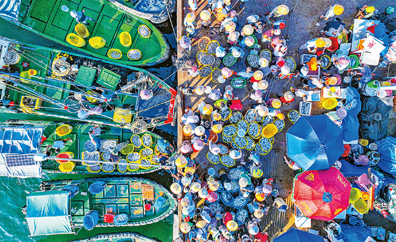 海南以調(diào)結(jié)構(gòu)、增動能、惠民生為重點,推動經(jīng)濟實現(xiàn)質(zhì)的有效提升和量的合理增長。圖為2023年9月22日早上,海南陵水新村疍家漁港,一筐筐新鮮的漁獲被搬運上岸,堆滿碼頭。 海南日報記者 王程龍/攝
