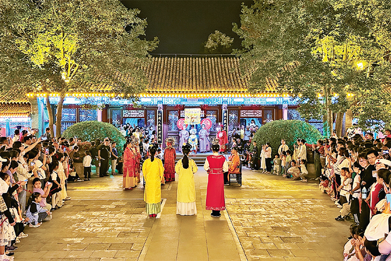 近年來,河北省大力推動文旅深度融合,深入實施文化惠民工程,全省文化產(chǎn)業(yè)快速發(fā)展,文化事業(yè)生機盎然。圖為2023年10月1日,石家莊市正定縣榮國府實景演出,生動還原了《紅樓夢》中的經(jīng)典片段,吸引眾多游客駐足觀看。 河北日報記者 張曉超/攝