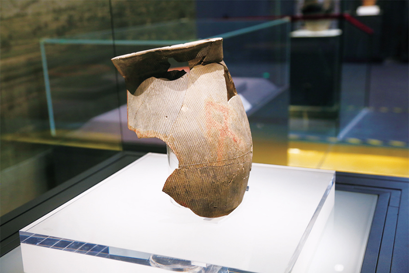 這件距今4000多年的陶扁壺上的“文”清晰可見。圖為2023?年?6?月?28?日拍攝的陶寺遺址出土的朱書陶扁壺(中國(guó)考古博物館藏)。 中國(guó)歷史研究院供圖