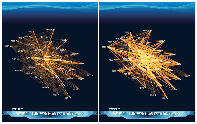 融合發(fā)展,交通先行。不斷完善的交通網(wǎng)絡(luò),成為長(zhǎng)三角經(jīng)濟(jì)社會(huì)發(fā)展的“助推器”,以軌道交通為骨干的一體化綜合交通網(wǎng)絡(luò)初步成型。圖為2018年、2023年安徽至江浙滬貨運(yùn)通達(dá)情況示意圖。2023年與2018年相比,安徽發(fā)送至江浙滬的貨運(yùn)量顯著增長(zhǎng),長(zhǎng)三角物流更為密集。 新華社發(fā)(新華社衛(wèi)星新聞實(shí)驗(yàn)室供圖)
