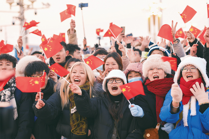愛國主義教育涉及面廣,內容豐富、形式多樣。圖為2024年1月1日晨,北京天安門廣場舉行隆重的升國旗儀式,觀眾在升旗儀式結束后歡呼。 新華社記者 陳鐘昊/攝