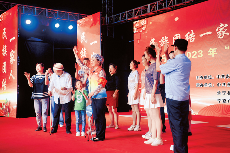 寧夏銀川市永寧縣2023年“民族團(tuán)結(jié)進(jìn)步月”啟動(dòng)儀式8月31日晚舉行。舞蹈《錦繡中華》、情景劇《鄰里和睦一家親》等節(jié)目,描繪了各族群眾像石榴籽一樣緊緊抱在一起,積極構(gòu)建共居共學(xué)、共建共享、共事共樂(lè)的互嵌式社會(huì)環(huán)境的故事。 寧夏日?qǐng)?bào)供圖 馬楠/攝