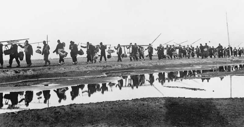 人民解放軍以摧枯拉朽之勢(shì)奪取三大戰(zhàn)役勝利,根本原因是我們黨同人民一條心、軍民團(tuán)結(jié)如一人。圖為1948年冬淮海戰(zhàn)役期間,渤海區(qū)擔(dān)架民工趕赴前線。 張韞磊/攝