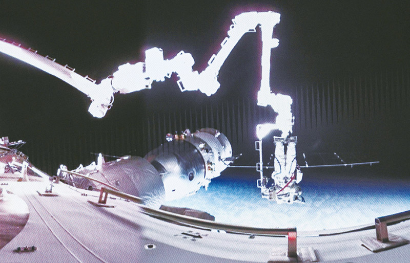 2024年3月2日,神舟十七號(hào)航天員乘組第二次出艙活動(dòng)取得圓滿成功,這是我國(guó)航天員首次完成在軌航天器艙外設(shè)施的維修任務(wù)。圖為在北京航天飛行控制中心拍攝的神舟十七號(hào)航天員江新林在空間站機(jī)械臂的輔助下進(jìn)行艙外作業(yè)。 新華社記者 李賀/攝