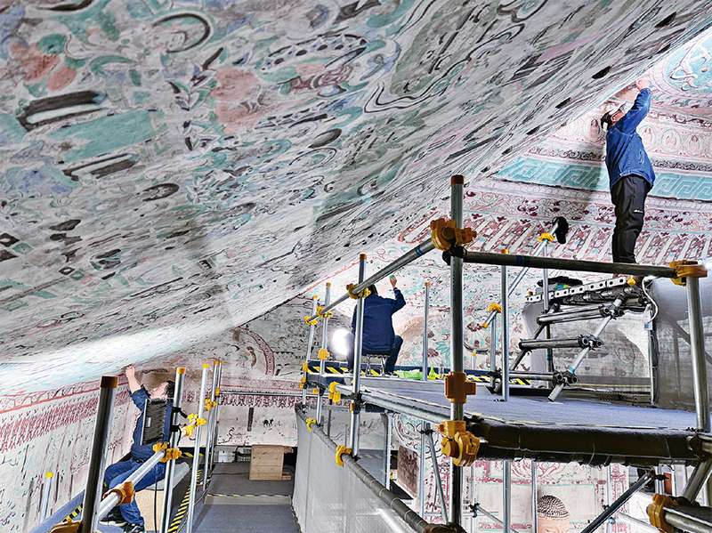 黨的二十大報(bào)告提出,要加大文物和文化遺產(chǎn)保護(hù)力度。文物不可再生,“保護(hù)第一”是新時(shí)代文物工作的首要遵循。敦煌研究院探索多種創(chuàng)新手段,實(shí)現(xiàn)了從被動(dòng)的搶救性保護(hù)到主動(dòng)的預(yù)防性保護(hù)。圖為2024年拍攝的莫高窟第55窟文物修復(fù)現(xiàn)場。 敦煌研究院供圖