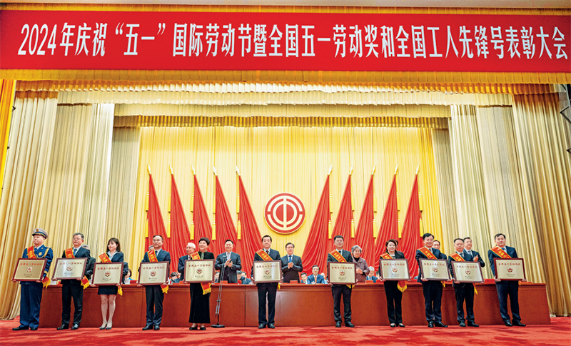 2024年慶祝“五一”國際勞動節(jié)暨全國五一勞動獎和全國工人先鋒號表彰大會4月28日在北京人民大會堂舉行。255個集體和1088名個人分獲全國五一勞動獎狀、獎章,1034個集體獲全國工人先鋒號。圖為榮獲全國五一勞動獎狀的部分集體代表在大會上合影。 新華社記者 才揚/攝