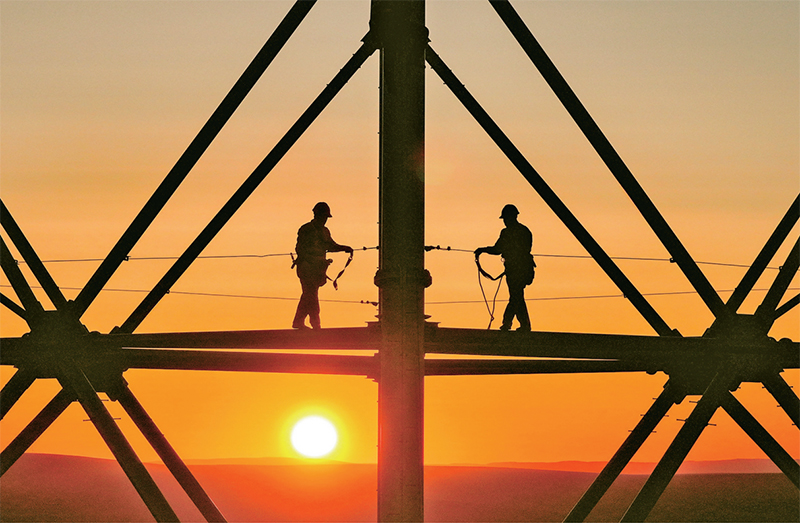 圖為2024年4月17日,工人在張北—勝利1000千伏特高壓輸電交流項目工程內蒙古段進行組塔作業(yè)(無人機照片)。 新華社發(fā) 王正/攝