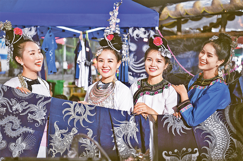 在“村超”系列賽事的帶動下,貴州省黔東南苗族侗族自治州榕江縣吸引了全國各地大量游客前往觀賽游玩,帶動了當(dāng)?shù)芈糜?、餐飲、住宿、文?chuàng)、農(nóng)特產(chǎn)品等行業(yè)的發(fā)展。圖為2023年6月30日,村民在“村超”賽場旁的文創(chuàng)攤位展示民族服飾。 新華社記者 楊文斌/攝